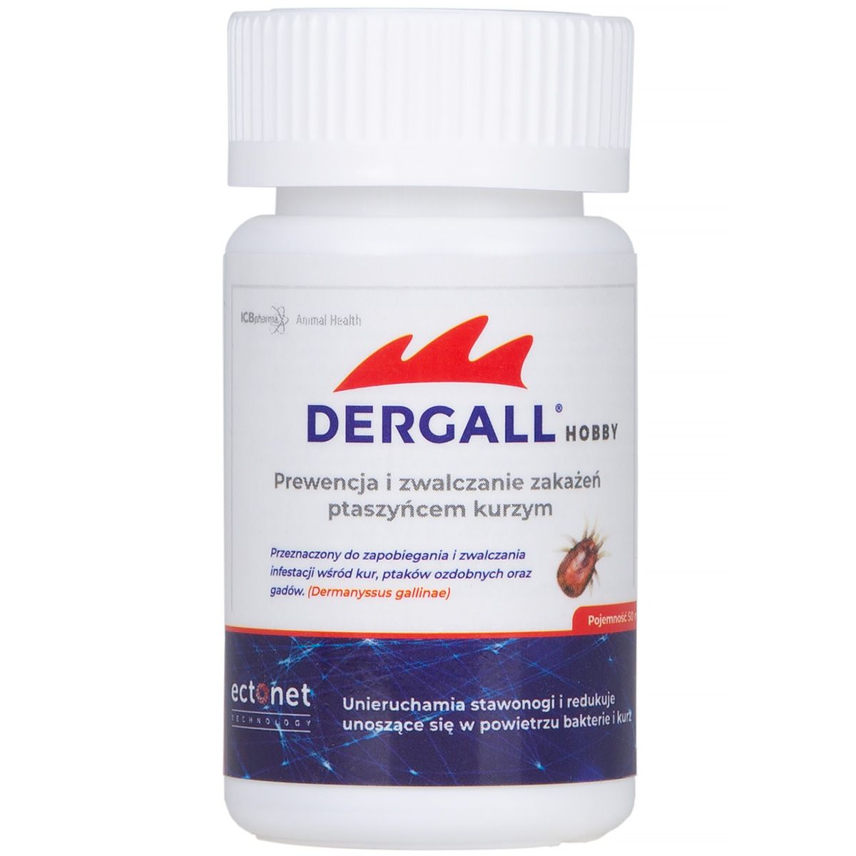 DERGALL 50 ml do zwalczania ptaszyńca kurzego, pchły kurze to skuteczny preparat do zwalczania ptaszyńca i innych stawonogów, takich jak: pleśniakowca, świerzbowców ptasich, roztocza szczurzego, roztocza gadów występujących w hodowlach drobiu. Środek Dergall można stosować w obecności ptaków, nie zawiera substancji trujących. Można go stosować we wszystkich rodzajach hodowli.