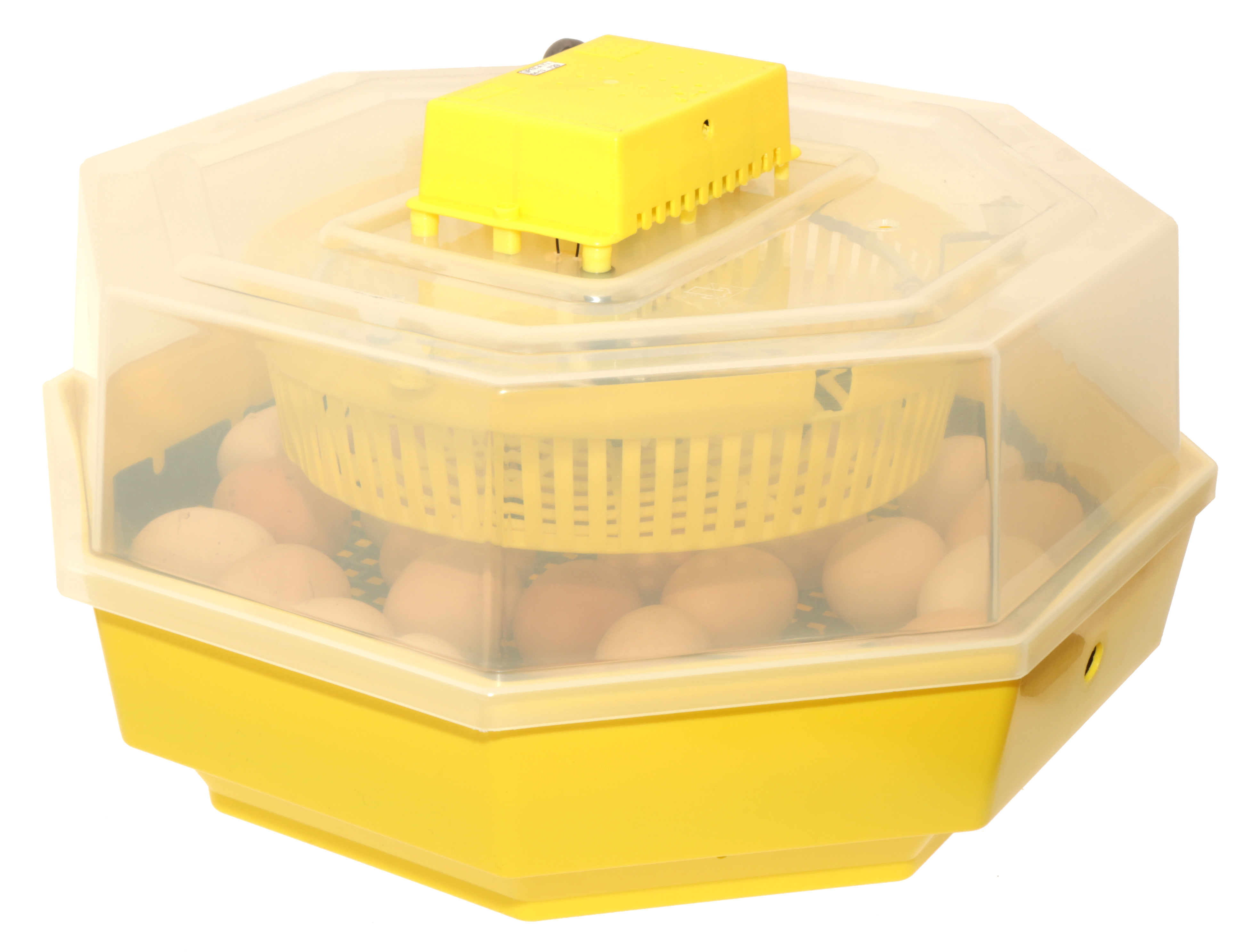 może pomieścić do 60 jaj kurzych. Wówczas jaja układana są w inkubatorze jedno przy drugim. Istnieje możliwość rozbudowania inkubatora o dodatkową półkę na jaja. Zwiększa ona pojemność inkubatora 2 razy. Wówczas inkubator będzie mógł pomieścić nawet do 120 jaj kurzych, (patrz